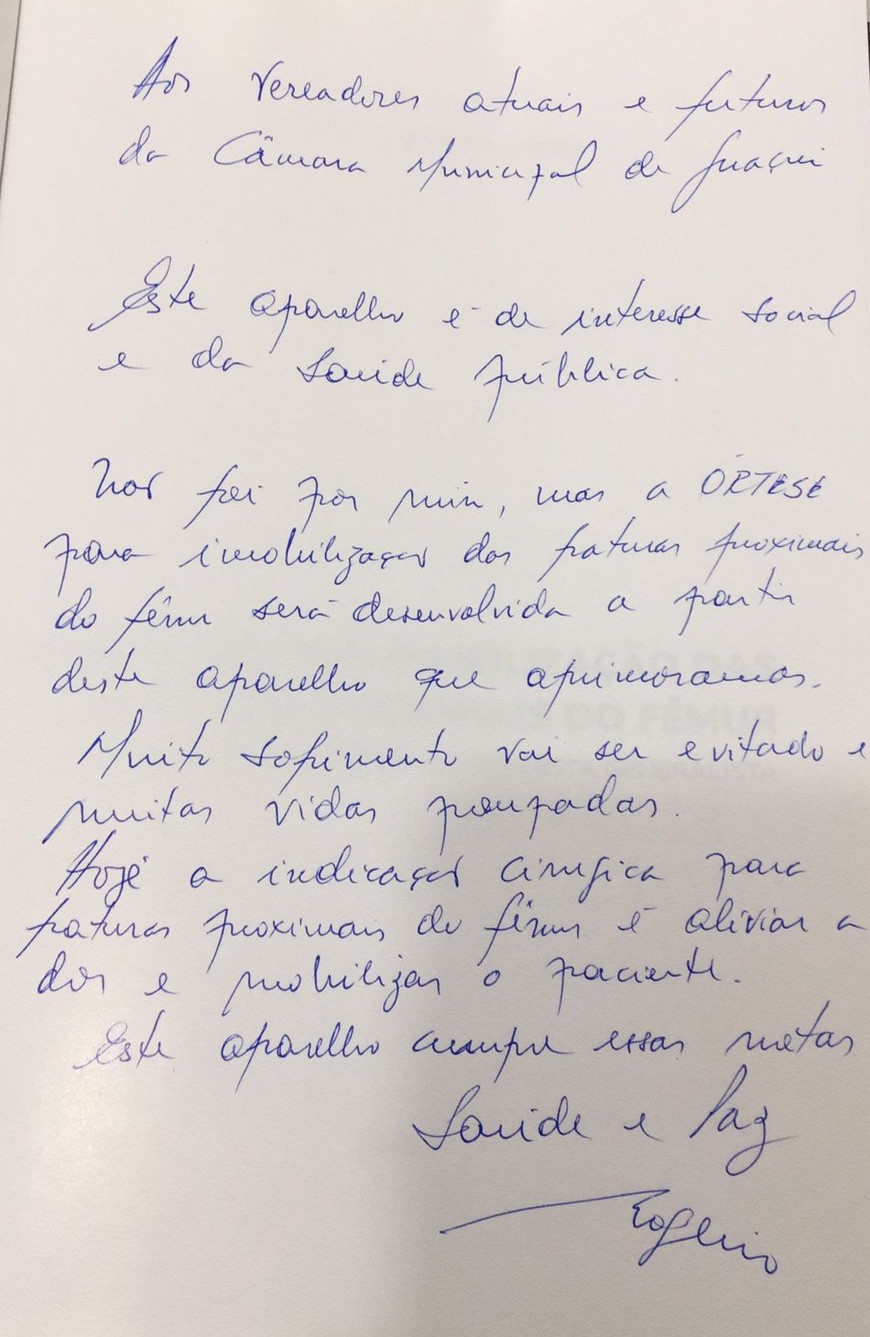 “E o futuro está escrito no livro, é a receita que eu dei para fazer a ÓRTESE, com esse aparelho nas ambulâncias, já no primeiro atendimento, no local que caiu, a pessoa ficará sem dor e vai para o hospital sem dor.”