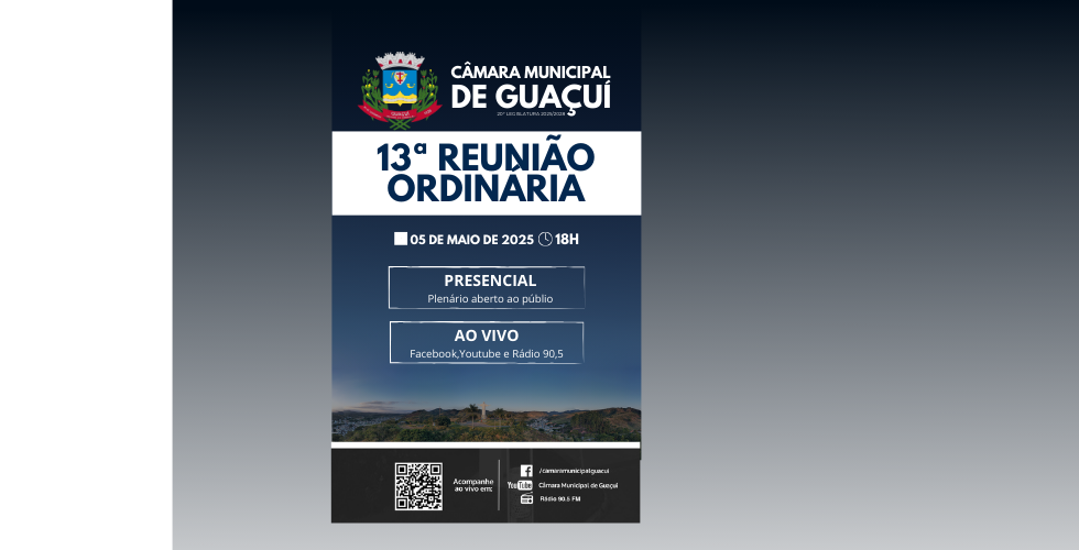Clique no link abaixo, para assistir as Reuniões Ordinária do dia 29/04/2025, realizada por meio de PLATAFORMA VIRTUAL, disponibilizada ao vivo no Facebook e Youtube da Câmara Municipal de Guaçuí.